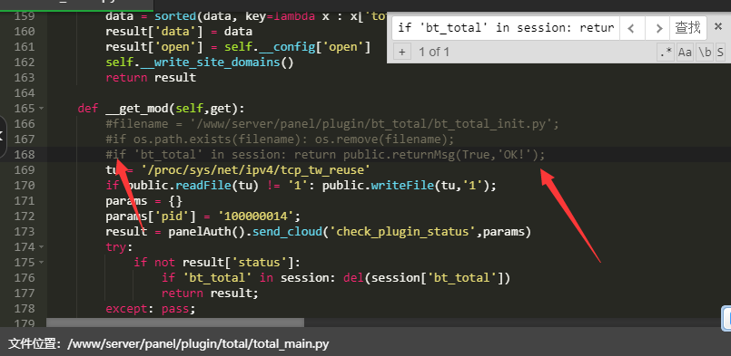 使用Ctrl+F搜索并找到if ‘bt_total’ in session: return public.returnMsg(True,’OK!’);这段代码