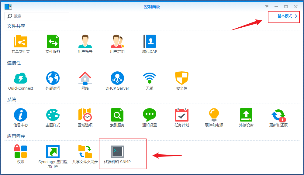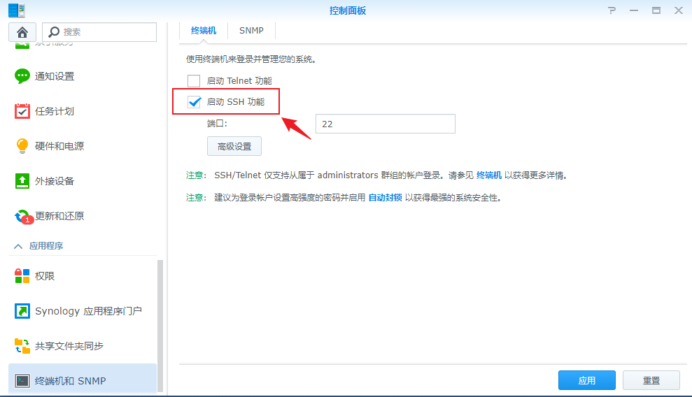 在群辉套件里安装docker–打开 控制面板–高级模式–终端机和snmp–启用ssh功能–应用