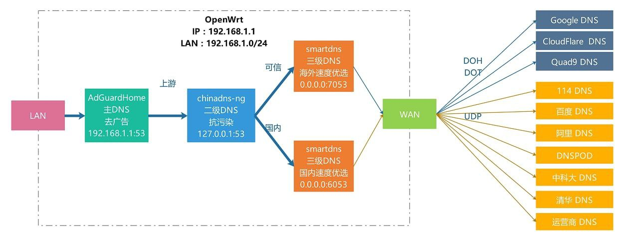 设备DNS查询-> 转发到adgurad监听的5353端口-> Dnsmasq监听的53端口->PASSWALL接管dnsmasq进行分流->smartdns相应的分流端口。下图可作为示例,但不是本架构的精确描述,且遗漏了Dnsmasq部分。